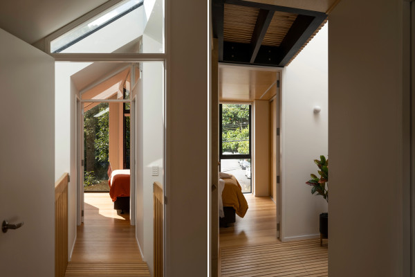 The new space is a contemporary three-bedroom build that both stands out and feels right at home among its character-filled neighbours. The street façade nods to the area’s traditional villas, while gracefully avoiding mimicry. “We pitched a contemporary house, which responded to the context through proportion and volume rather than material similarity and cladding detail, whilst dealing with some of the problems associated with Aro Valley houses, namely being cold, dark and cramped,” says Tim.