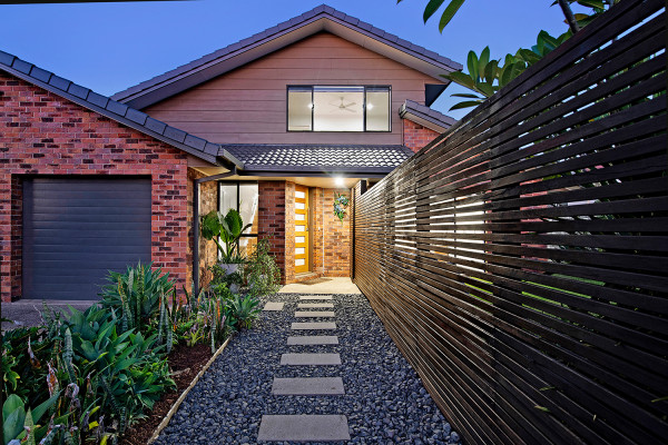 Upper weatherboards in Resene Wombat, fence in Triple Friar Greystone.