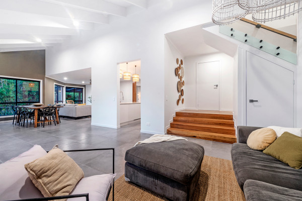 Inside, the home offers moments of drama. A cathedral ceiling soars above the secondary living and dining area, while a large bank of windows frames lush bamboo views. There was plenty to love, but also plenty to do to make it into a fresh new space the family would love.