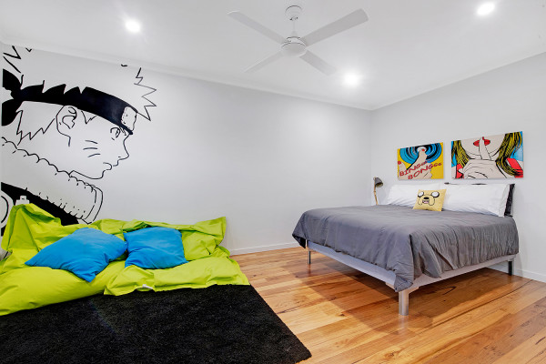 One of the most personal spaces in the house belongs to the client’s son. His bedroom features a hand-painted Naruto mural created by Amy herself. “The mural took a day to complete, with the client’s son completely surprised at the reveal after school,” she says.