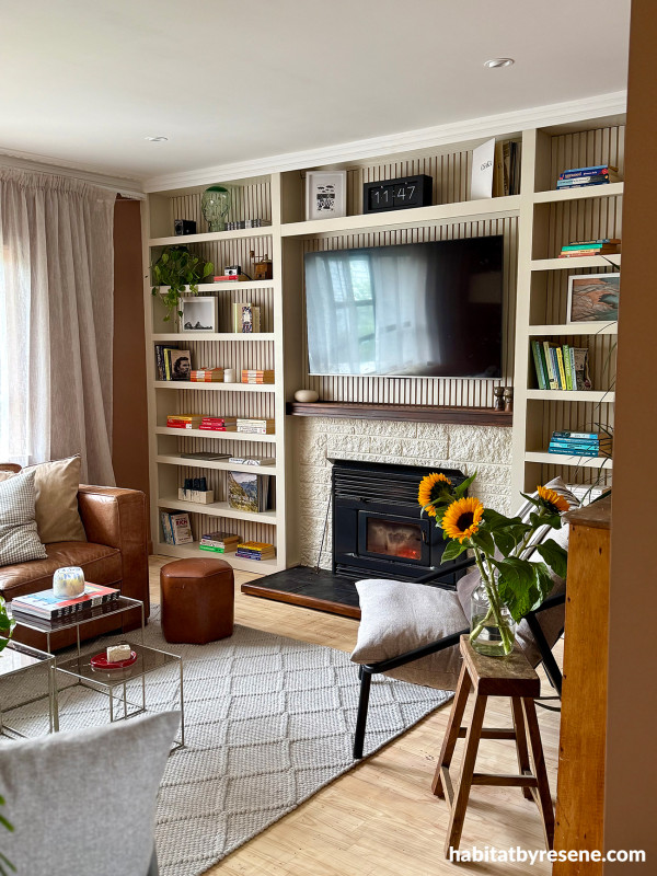 The walls are now painted in a refined tan brown, Resene Leather, using Resene Zylone Sheen in a low sheen finish. The panelling, fireplace and bookshelf are painted in a light beige that pairs perfectly with the brown, Resene Parchment using Resene SpaceCote Low Sheen. The timber mantlepiece and tile surround of the fireplace are now stained in Resene Colorwood Bark adds to the cosy, sophisticated vibe, and the ceiling in Resene SpaceCote Low Sheen in Resene Alabaster brings a touch of lightness into the room.