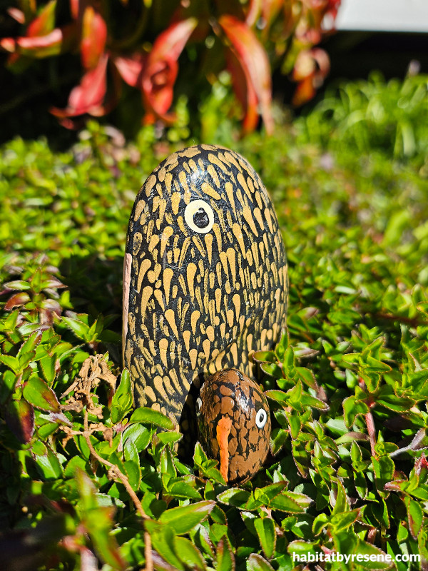 “I get my rocks from a local landscaper who is very generous with good deals and lets us choose our own rocks, mostly flat ones. I paint a Resene Black base which is the only brushwork I do. I am never sure how I will start or finish a rock, it just seems to happen. I consider myself the least artistic person I know which is quite surprising as they have become almost collectable to some people. I finish them off by covering them with a resin coating.”