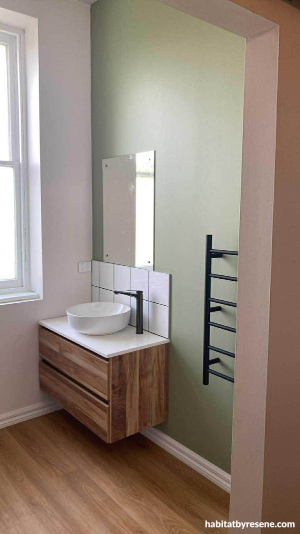 Caryn added a lovely blend of green and white to the ensuite in one of the boarding rooms at her home. On one wall is the gentle green of Resene Sage, and the surrounding walls are in Eighth Tea. This combination pairs beautifully with the wood tones on the vanity and floor.