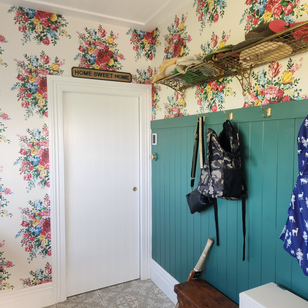 Entryway features Resene Pip Studio Wallpaper Collection 341040_1 with Resene Stromboli on panelling and White on trims and doors.