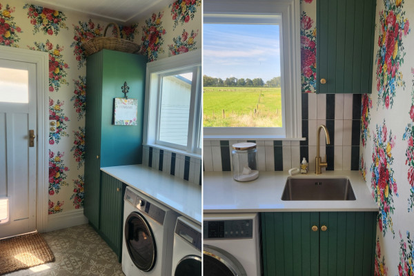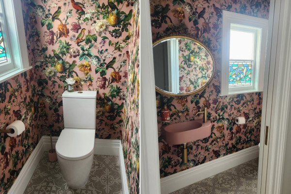 In the laundry, Resene Stromboli brings depth to the cabinetry, paired with playful Resene wallpaper. “I painted our kit set kaboodle cabinets in Stromboli semi-gloss and wallpapered the rest of the walls in Resene Pip Studio Wallpaper Collection 341040_1. I wanted this space to be fun and cheerful as it also doubles as the back door entry into our home.” The powder room continues that sense of personality with the bold Resene Museum Wallpaper Collection E307304 where the blush pink colour pairs beautifully with the Caroma sink.