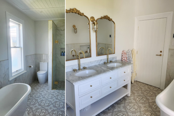 The kitchen is a gorgeous sight, with cabinetry painted in Resene Villa White and Jet Stream, creating a soft, classic look that sits comfortably within the villa setting. The kitchen itself is a mix of clever sourcing and custom work with units bought off Facebook marketplace and repainted, and a custom rangehood, inspired by an English design, adding a sense of age and authenticity. “It really finishes off the space and suits the age of the house so well,” says Amy.