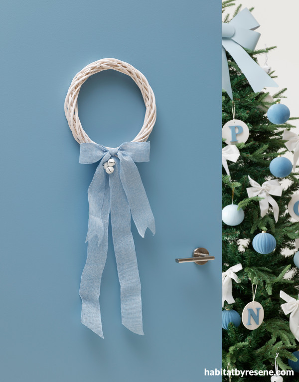 To create a simple, modern wreath in your own colour scheme, use some garden twine and wind it together, or get a wicker wreath from Kmart like ours, and paint it in your chosen shade. We painted ours in Resene Half Rice Cake then took some ribbon and tied a bow and glued to the wreath. As simple as that. To finish it off we added a couple of cute white bells. This bow pairs beautifully with our front door and decorations in Resene Bermuda Grey and Half Halcyon.