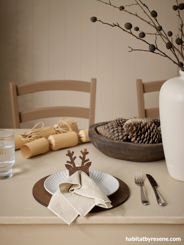 If you’re a neutral lover, opt for a warm, rustic design. It’s summer in New Zealand but warm neutrals and the right décor can make it feel like you are in a cosy rustic cabin in the snow. On our Christmas table, it’s the small touches that matter. We took a plain wooden bowl and stained it in Resene Colorwood English Walnut and added some pinecones, and to coordinate this we also took some inexpensive plywood placemats from Kmart and stained these along with some reindeer napkin rings in Resene Colorwood English Walnut to tie the whole table setting together. The timber pairs beautifully here with the toasty neutrals like Resene Double Drought on the table, Resene Tobacco Brown on the chairs, Resene Drought on the walls and Resene Half Drought on the vase.