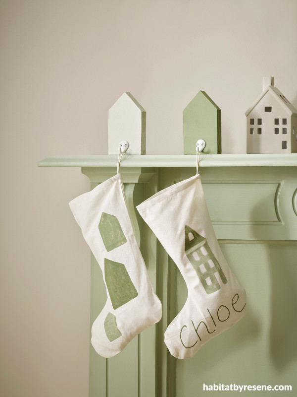 Decorative stockings can be pricey and add up if you need multiple! We got some calico ones from Kmart and decorated them ourselves by painting the house shape design onto them in Resene Finch, Bud and Flax. You could also add the names of your family members to personalise them. These can all be done using Resene testpots and can be whipped up in an hour!