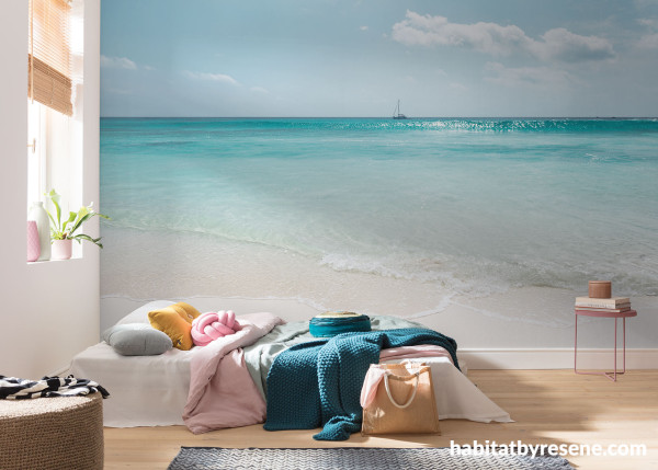 If you don’t live near the coast, or just don’t have time to get down to the beach, this is the perfect option for you. One of Resene’s many beachy wallpapers, like Resene Komar Pure Wallpaper Collection PSH097-VD4, will make you feel like you’re lying on the beach with a slow breeze brushing by and the sound of waves lapping on the shore. This particular design, with its soft blues, also adds a sense of calm and relaxation, ideal for the end of a long day. Pair this with cool whites like Quarter Black White and Quarter Sea Fog along with a stain on timber floors from the We Speak Beach range, and you’ve got yourself the ultimate beach getaway.