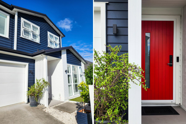 This home knows just how contrast works. The homeowners chose Resene Indian Ink for weatherboards, which they say is a stunning shade that shifts beautifully throughout the day. It’s paired with the crisp Half Black White and a welcoming, bright red front door.