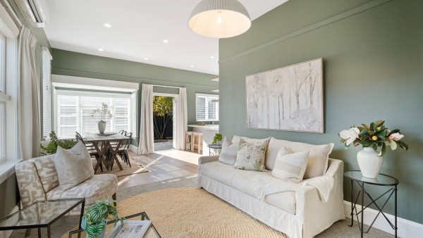 In this living space, neutral furniture and décor create a welcoming space and contrast against the walls painted in a soft sage green, Resene Vantage Point. The ceiling and trims are painted in Black White. Project by City Style co, image by Harcourts Holmwood.