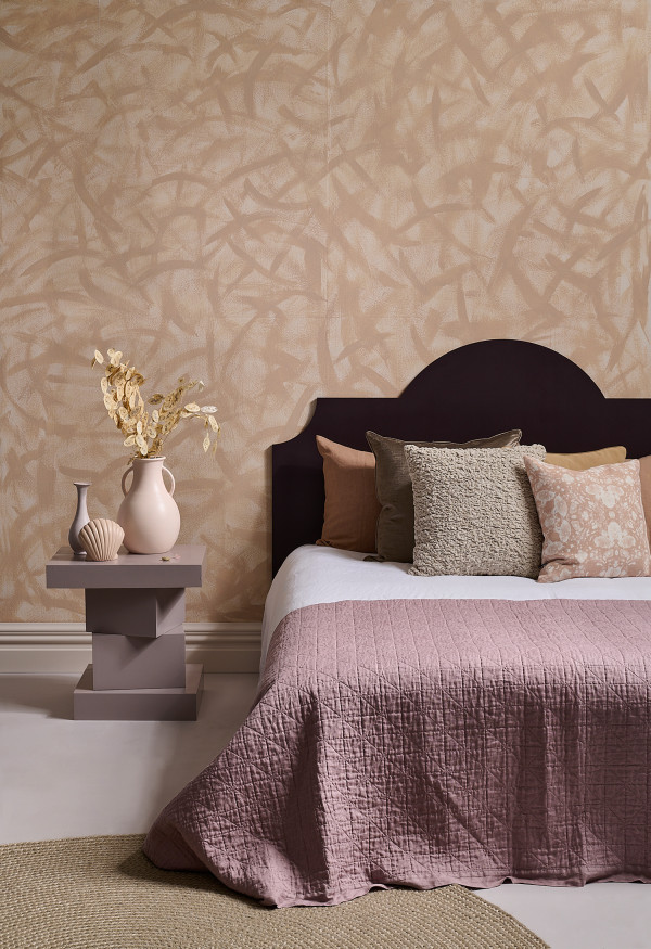Here, the warm, pinky browns of rosewood envelope this bedroom making it a warm and welcoming space. The wall is painted in Resene Bleach White with brushstroke texture in Resene FX Paint Effects Medium mixed with Cashmere. Floor in Dover White, trims in Bleach White, headboard in Caffeine, table in Tom Tom, vases in Karry, Cashmere and Dover White. Bedding from H&M Home. Project by Kate Alexander, image by Bryce Carleton.