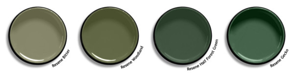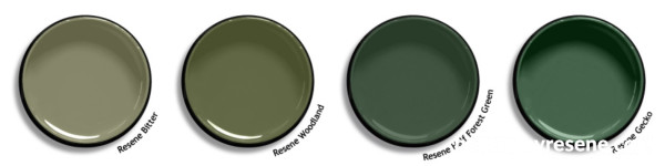 “There are two exceptions to the pales and darks. That is a handful of greens like moss and forest tones that sit in the midtones – Resene Bitter, Woodland, Half Forest Green and Gecko.”
