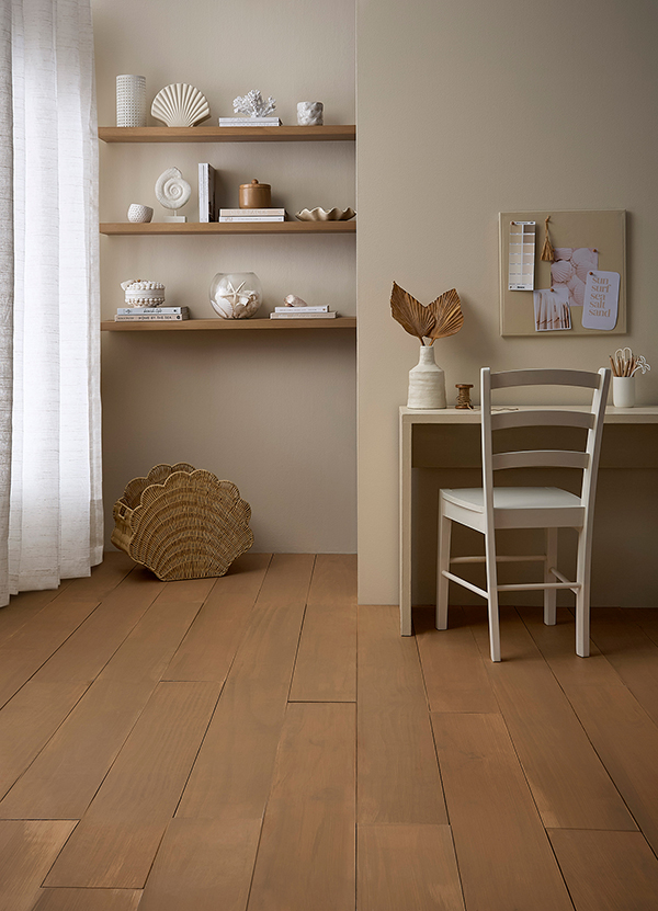 Keep the palette simple to minimise visual noise, especially in smaller zones, then add texture with a subtle wallpaper or Resene FX Paint Effects Medium and natural materials like wood, stone and ceramics. A slim desk, a comfortable chair and one good desk lamp are often all you need. Use floating shelves or a peg board to keep the surface clear, and consider using a single accent colour to tie the elements together.