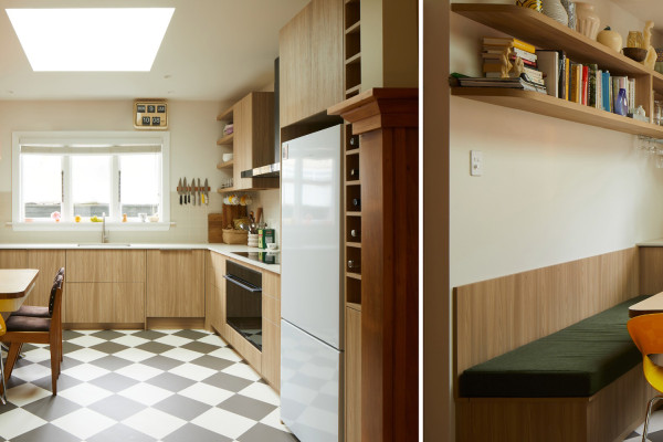 Above it all, a large central skylight pours light into the southern side of the house, lifting the checked flooring and giving the whole space an easy, mid-century feel. Timber cabinetry, clean lines and warm tones keep everything feeling grounded and relaxed rather than retro for retro’s sake.