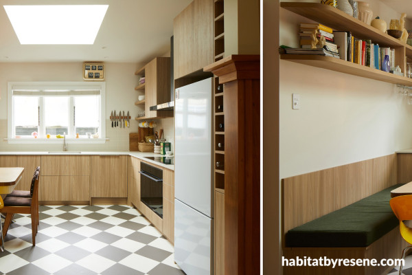 The kitchen is painted in Resene Rice Cake, a warm white that brightens the space.