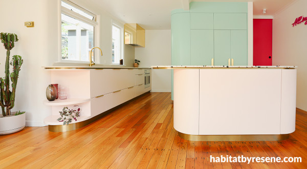 Gentle pinks like Resene Pot Pourri on the kitchen island and drawers contrast with bolder pinks like Colour Me Pink on the internal door and Padua on cabinetry. The walls and ceiling are in Half Rice Cake.