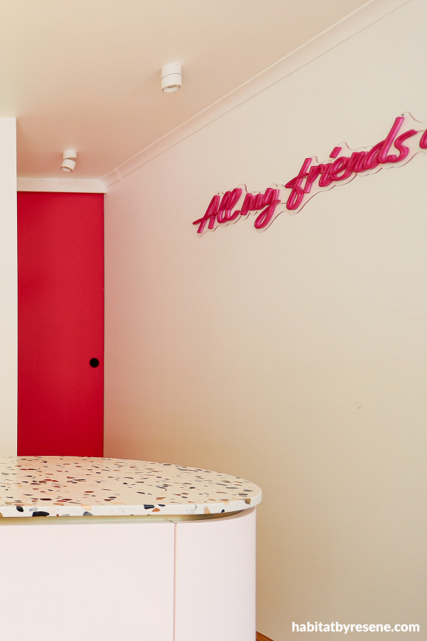 Then there’s the moment of drama that takes the whole home from day to night. “The Colour Me Pink cavity door adds the ‘wow’ when the neon light is on and the night kitchen comes alive.”