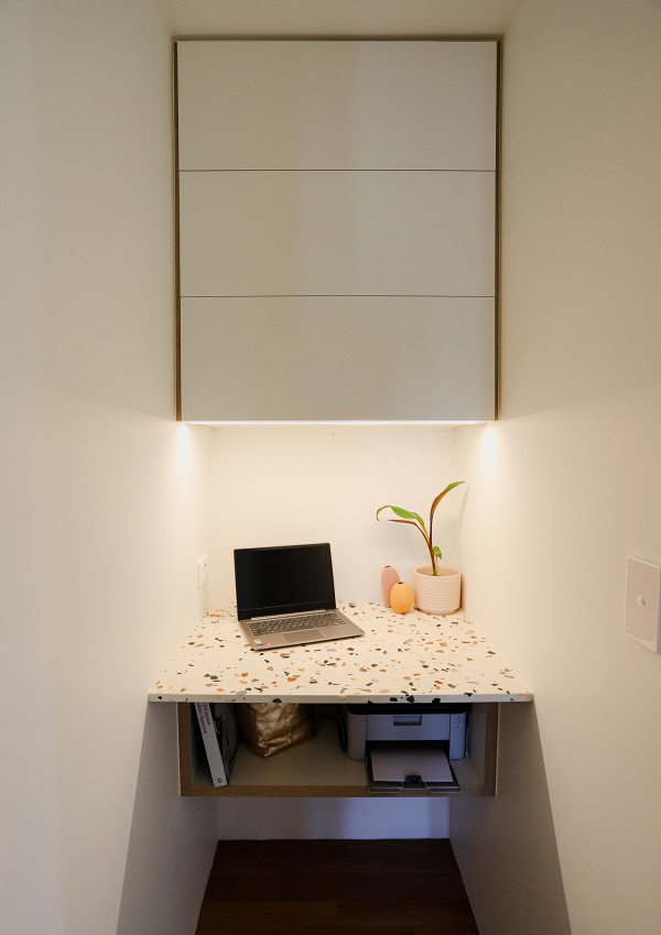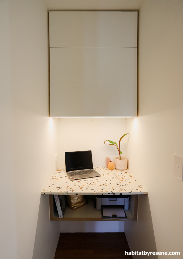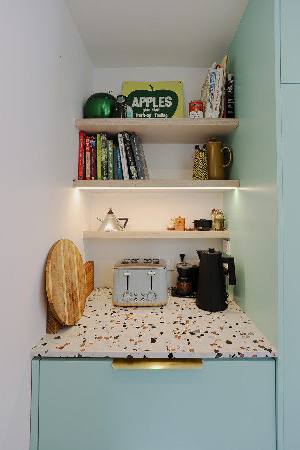 The terrazzo tile, a touch of design inspired from the exterior, was used on the kitchen benchtops. The cabinetry is in Resene Padua and walls in Half Rice Cake.