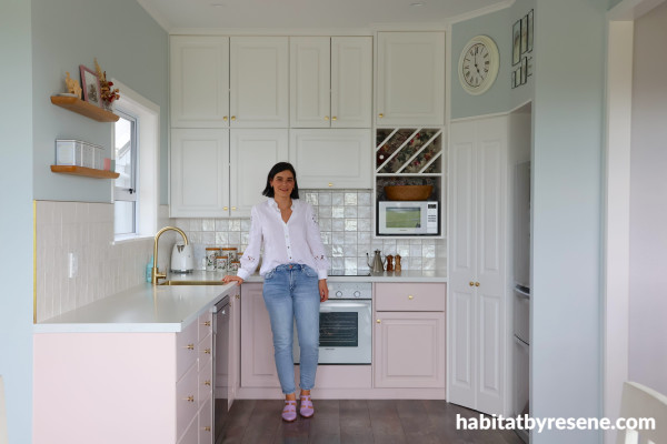 Bridget in her favourite room of the house, the kitchen. The cabinets are painted in Resene Double Alabaster and a gentle pink, Resene Ethereal, and walls in Resene Half Duck Egg Blue.