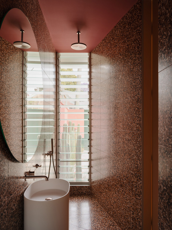 This bathroom is small but mighty. The space is cocooned in red toned tiles which pair beautifully with the bold Resene Red Oxide on the ceiling. The colourful garden wall is also visible through the window painted in Resene Red Oxide and Resene Fugitive. Design by Lymesmith, image by Clinton Weaver.