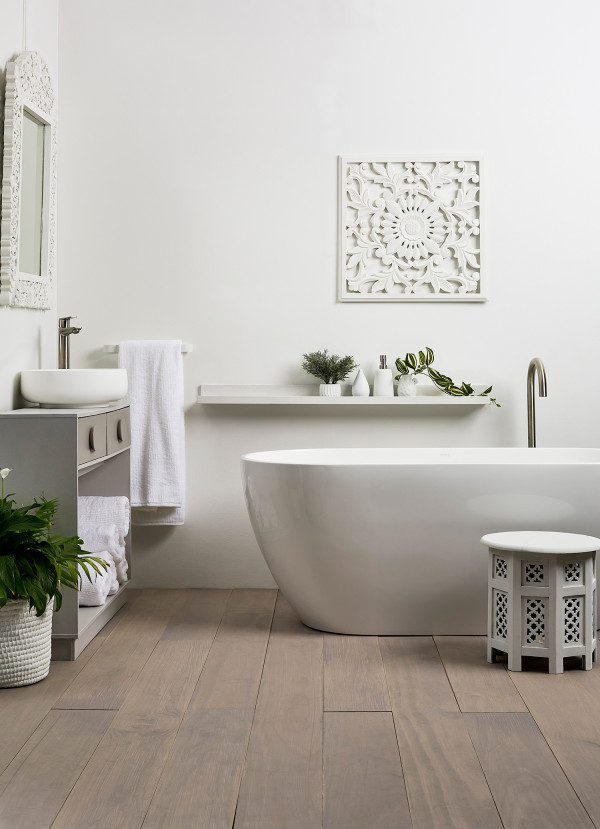 If you’re loving your white bathroom but want something a little different, try one of Resene’s wallpaper murals. Resene Infinity 2 Wallpaper Collection IFSH2-027 adds a burst of real-life nature into this space, giving it depth and a focal point behind the bathtub.