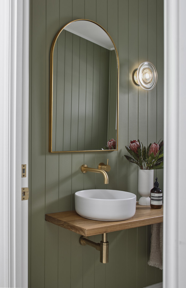 This elegant bathroom brings touches of brass against the warmth of timber accents and walls painted in a calming green of Resene Flax. The doors and frames are painted in Half Wan White for a striking contrast. Design by Davey Construction.