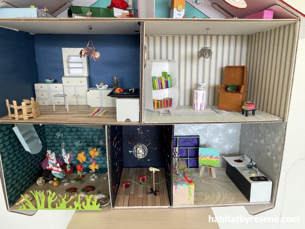 Zoe’s winning home featured all of her favourite things including an underwater room decorated with Resene Wallpaper Collection E378032 and fish made by Zoe out of polymer clay and painted in Resene colours. The disco room is painted in Resene Indian Ink with assorted testpot paint splashes on the walls. In the laboratory/art space eagle eyed people will spot a tiny microscope and petri dish on the tabletop.