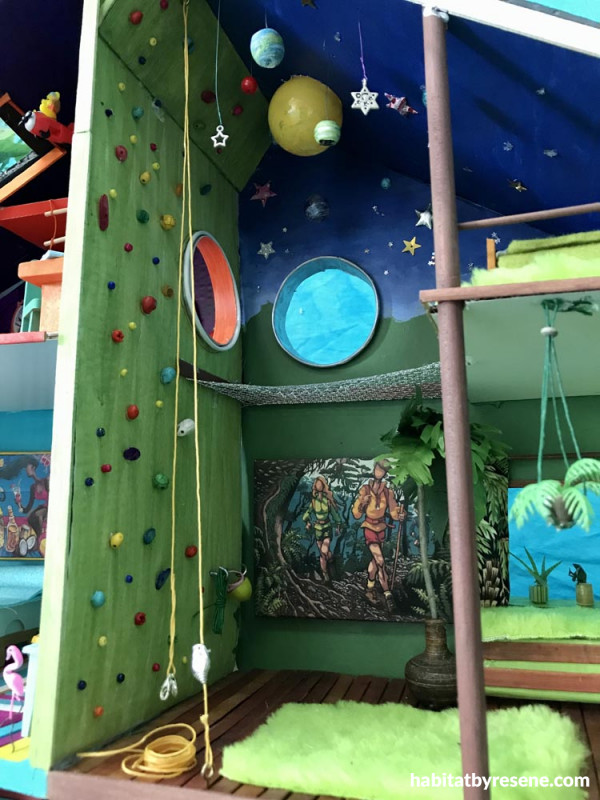 Artist Sirpa designed her teeny house for an adventurous family. Her rock climbing wall is painted in Resene Bush with Resene Aviator on the top half of the wall. Resene FX Nightlight glow-in-the-dark paint illuminates the stars and planets at night and Resene FX Metallic in Silver Aluminium on the windows is designed to replicate the weightlessness of space travel as the teeny house occupant scales the rock climbing wall.