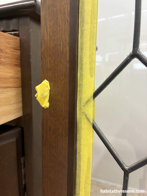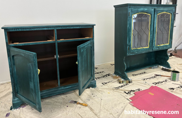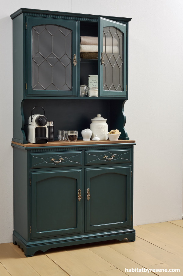 She imagined it in a deep green with a touch of blue and paired it with polished brass handles. Best of all, she discovered she didn’t need to do heavy sanding. “Resene have a great shortcut called Resene Sureseal – it’s designed to go over varnished surfaces, so you don’t need to sand everything right back,” says Sarah. “I just smoothed out a few rough patches.” After taping up the glass and using washi tape on the edges she primed, painted it with three coats of Resene Welcome, then sealed with Resene Aquaclear. “A piece of hardwood was added and stained in Resene Matai to create contrast and a benchtop feel, which made it more practical to use in a bedroom as a coffee station.”