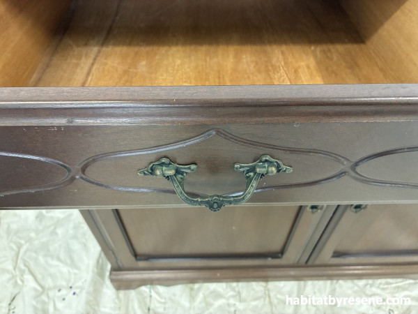 With a contemporary vision in mind, Sarah began the upcycling journey. She was thankful to discover that the piece came apart in two sections, she labelled the hardware and drawers as she took it apart for prep work.