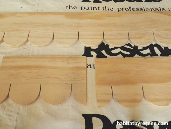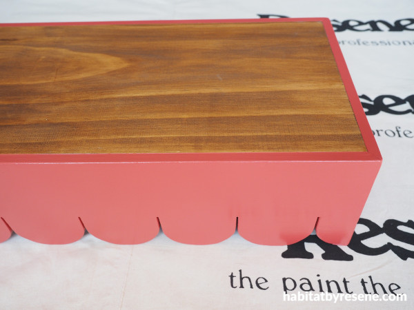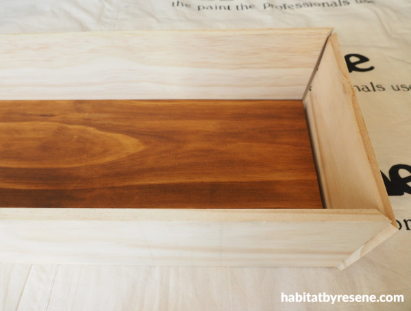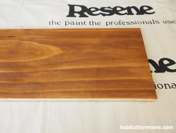 Step 1: Start by cutting the main board to width and length (mine is 22cm wide and 117cm long). Sand any rough edges smooth and then stain the board with one coat of Resene Colorwood Walnut, or for a darker finish apply two coats.