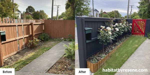 Sally decided the front gate of her home needed spicing up. She wanted a dark colour, but didn’t want it to be completely black so opted for Resene Double Foundry as it has a slight blue tinge. For an added burst of colour she painted her fence in bright red Resene Jalapeno.