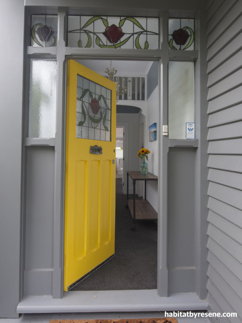 Yellow and grey are a great current combo. This front door is painted in Resene Turbo, and teamed up with Resene Double Trojan weatherboards and trims. The colours were chosen by Christchurch homeowner Nicola.