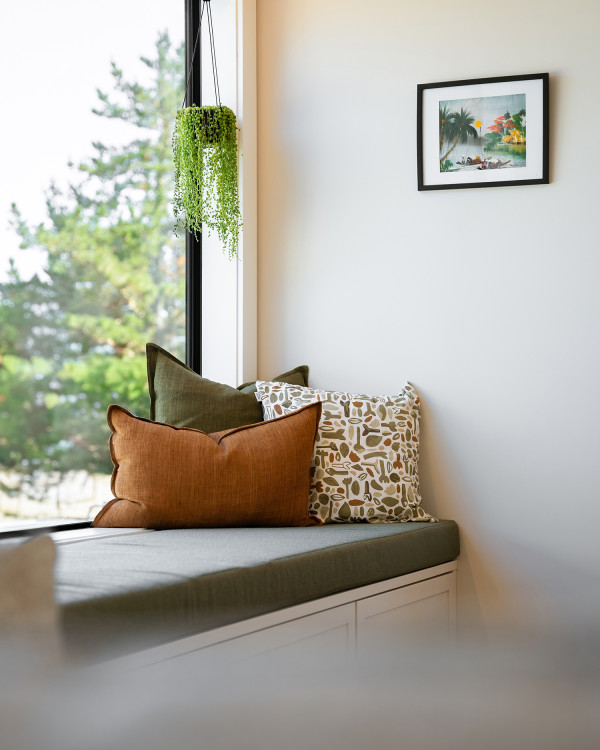 In this window nook, the walls and storage unit are painted in Resene Quarter Truffle and trims in Resene Half Rice Cake.