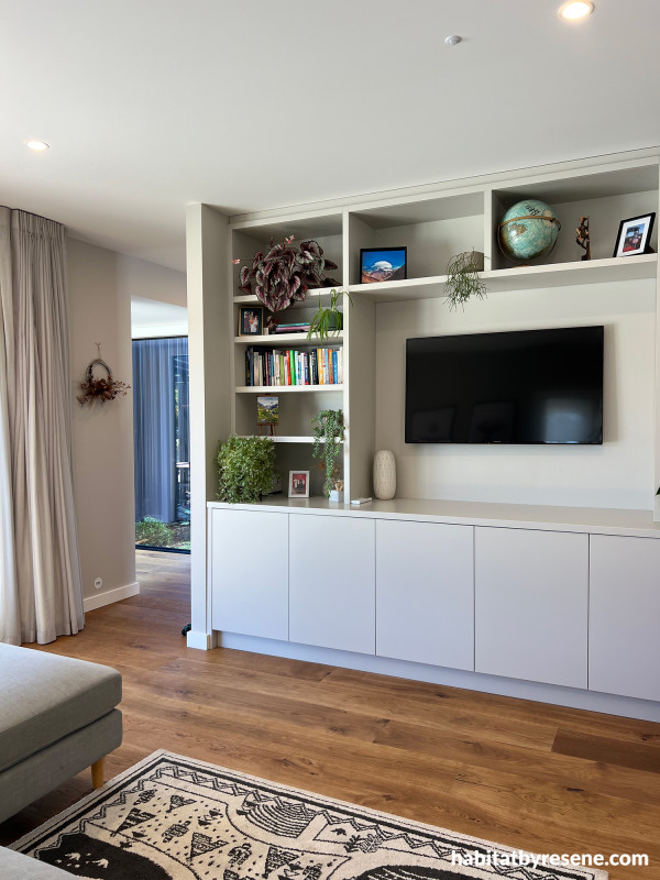 The main walls are in Resene Zylone Sheen in Resene Quarter Truffle, and to bring depth and variation, Jamie used Resene Half Truffle on the rumpus walls and cabinetry, creating a subtle shift in tone that gives the space a cocooning, media-room feel. In slight contrast, the kitchen cabinetry features Resene Truffle, a deeper version of the same hue that subtly adds the kitchen into its own zone within the open-plan space.