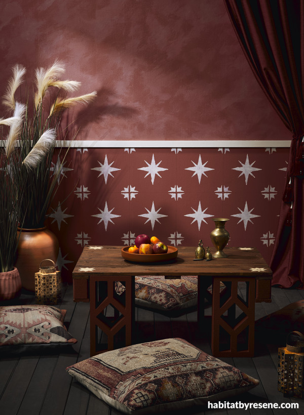 In this Moroccan-inspired space, the walls are painted in Resene Apple Blossom with Resene FX Paint Effects Medium mixed with Resene Quarter Solitaire on top, stars on the bottom of the wall in Resene Solitaire, tabletop stained in Resene Woodsman Bark with star border sponged in Resene Manhattan, breeze blocks in Resene Mocha, large pots in Resene Cinnamon and Resene Mocha, lanterns in Resene FX Faux Rust Effect, decking stained in Resene Woodsman Tiri and trays in Resene Burgundy and Resene Cinnamon. Floor cushions from Yuva. Project by Melle van Sambeek, image by Bryce Carleton.