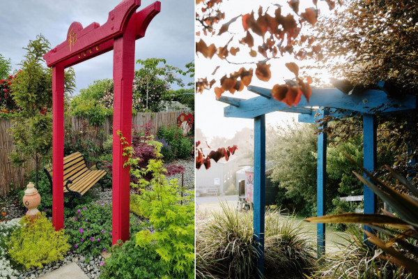 Add a pop of colour to your garden with a painted arch. (Left) Winner of Resene’s Garden Glow Up competition, homeowner Chris and her husband transformed their garden into a Japanese-inspired sanctuary including an arch painted in Resene Rock N Roll and Resene FX Metallic Gold. (Right) Amy’s Villaleigh Gardens and Nursery draws in visitors with its abundant flowers and vivid hues like Resene St Tropaz on this archway. Image by Ruth Gilmour.